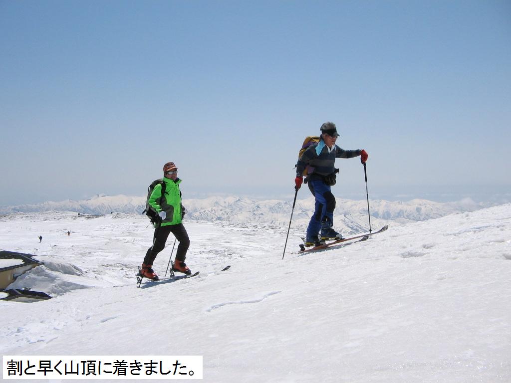 山頂まで板を付けたまま登る事ができました。山頂からは、誰も滑っていない南面の大斜面を各自思い思