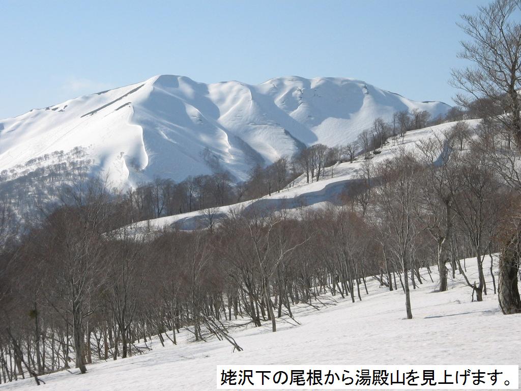 曇り空の中、石跳沢を滑る事にしました。湯殿山の出合近くまで滑って皆はネイチャーセンターへ・・・。