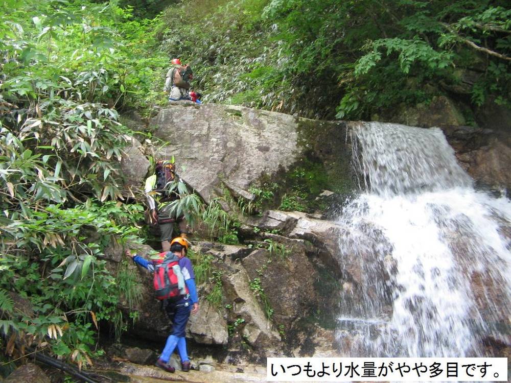 行けず楽しみな一日となりました。入渓点からは水流が見られ水量の多さが伺えま す。いつも以上に多い水量
