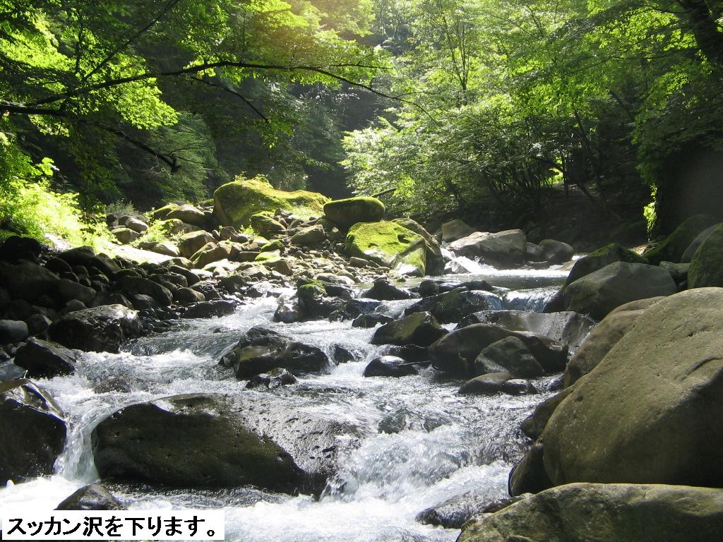 ます。咆哮霹靂の滝下で桜沢はスッカン沢と交わり、今回はこのスッカン沢を最初に下ります。ほどなく