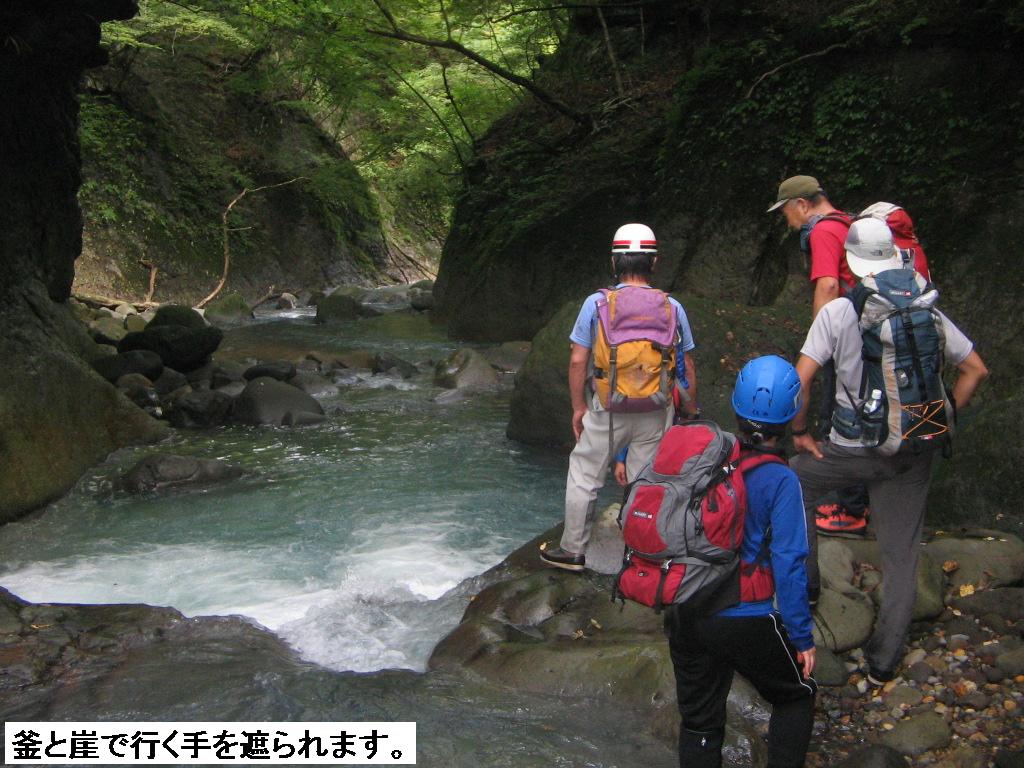 して大きな釜と両側が崖の地点に出たため今回はここまでとし、ここからスッカン沢を登り返します。