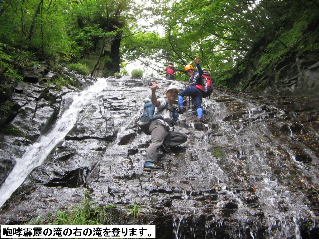 《コース》事務所8:00===8:35学校平8:50−−−9:57咆哮霹靂の滝10:00入渓10:18−−−スッカン沢