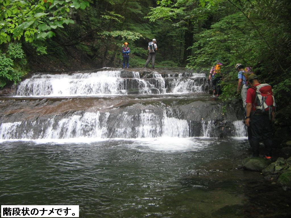 咆哮霹靂の滝は右側の滝を登ります。この上からは広〜〜いナメ・・水量も豊かでとっても気持ちの良