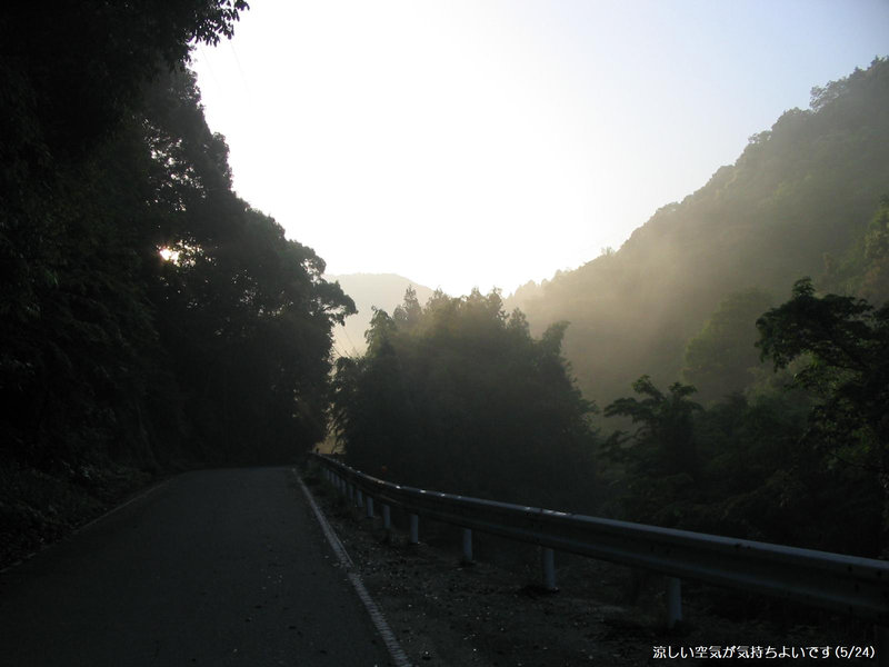 昨晩降った雨がもやをつくり、木々の露が朝日に輝きキラキラしていました。今までも見てきた光景。当たり