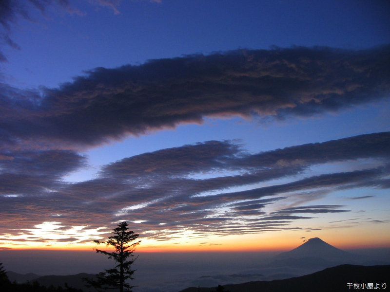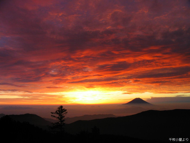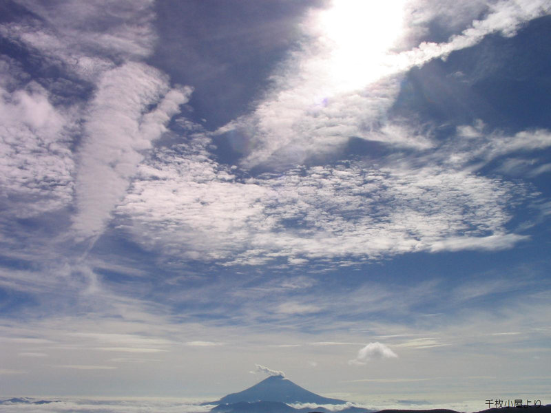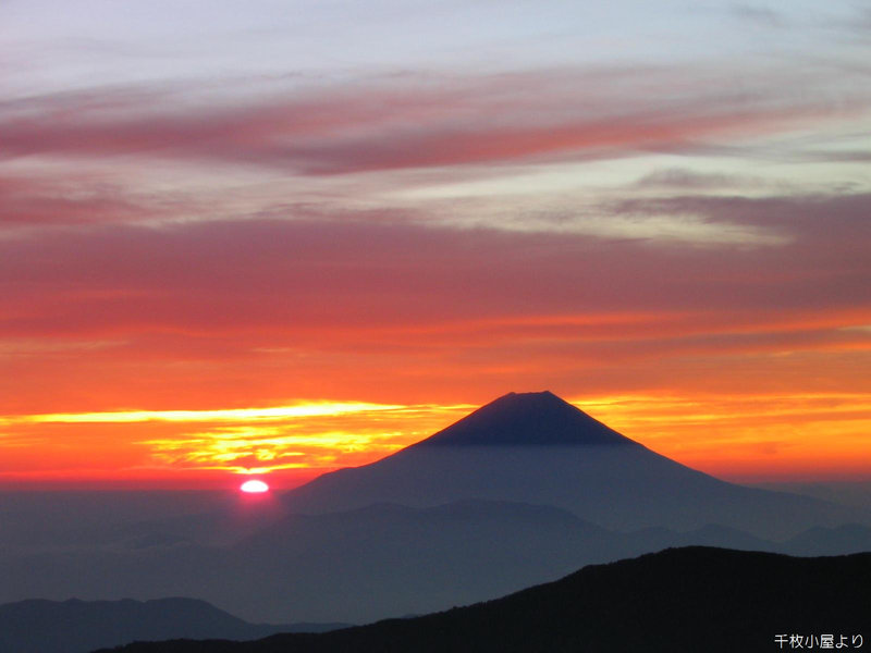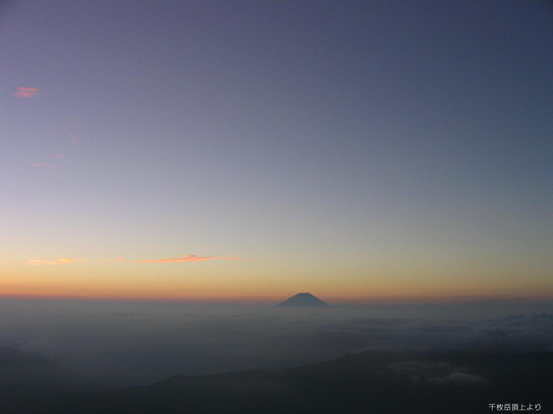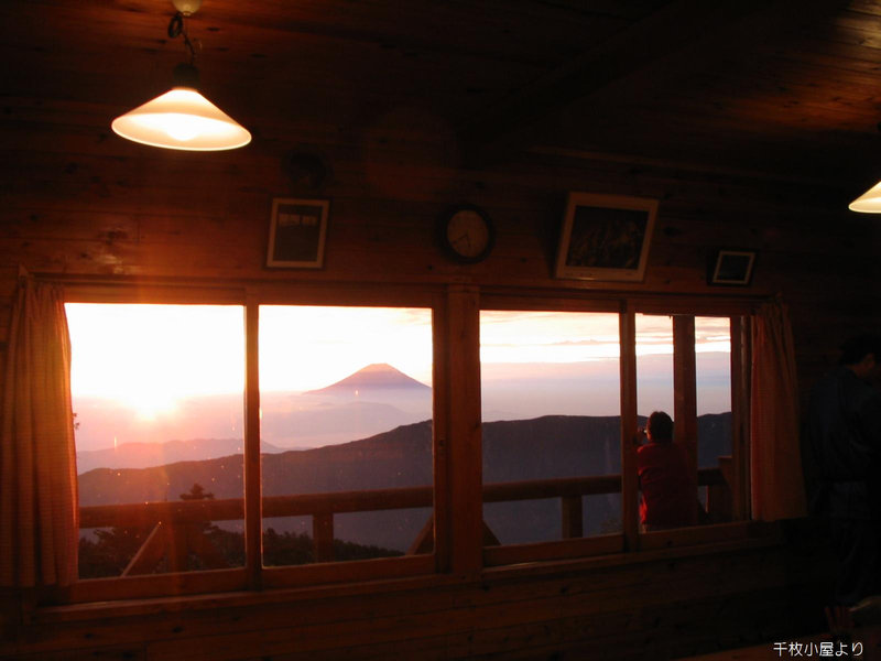 小屋を早くに出て千枚山頂で朝食を食べる。天候は最高で小屋から見るご来光とはまた違ったご来光を拝むことができた。