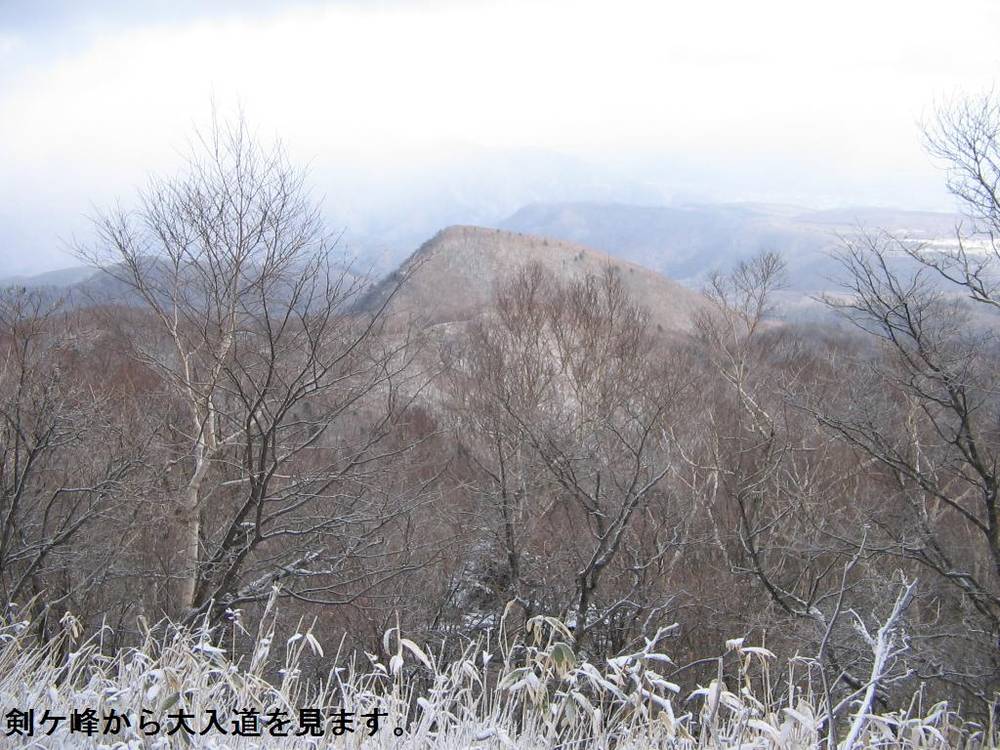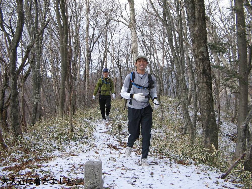ミツモチ林道を下り、大間々からの登山口で『剣が峰から大入道へ行こう』と言う事になる。雪はシューズを