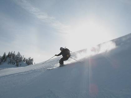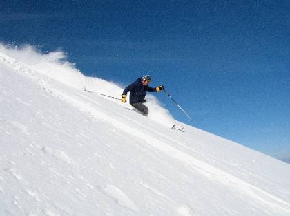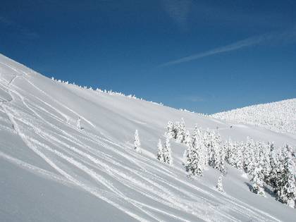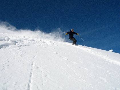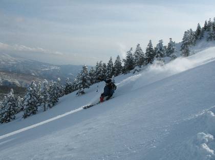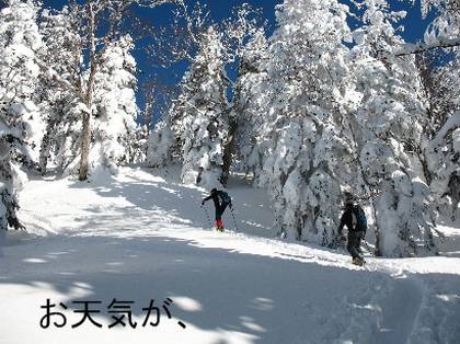西大巓 山スキー 《山行日》07/01/21(日) 《参加者》 1/21(日)東、平石、増渕 《要約》久ぶりの西大巓、快晴の中、楽しく山スキーが出来た。4回登り返したのでさすがに疲れた。 《本文》 1/21(日)無風、快晴 次週の偵察も兼ねて西大巓に山スキーへ。先発の平謙さんとスキー場エントランスにて予定通り合流。ここは ガスがあると全く楽しめないが、今日は朝から晴天、山頂にかかっている雲もリフトを乗り次いでいる間に何処 かへ。 回数券を1枚余分に買ったので1本ウォームアップラン。ゲレンデトップでシール登高の準備をし登り始める。 昨日のトレース及び先行パーティー有りでさくさく登る。一昨日の降雪が20〜30センチほど有り期待に胸を膨 らませる。1時間ほどで山頂に到着、なんとお手軽である。 西吾妻ー二十日平をめざすツアーパーティーが6−7名ほどと、後続から2−3パーティー、すでにお目当て の斜面を滑っている2人組もいた。よく見るとその2人組は知り合いでした。 山頂からは、那須、日光連山、ヒウチ、飯豊と朝日(はもう、目の前)月山、安達太良、の大パノラマを展望、 もうこれだけでも大満足。 一休みをして滑降。感触は、日が当たっているものの、気温が低めなのでそこそこにドライ。平謙さん、続いて 東さんが奇声をあげながら斜面を滑って行く。相変わらず平謙さんは電光石火のハイスピード。東さんはスヌー プダディーを初おろしで、相当調子がいいのか?かなり攻めている。 標高差200Mを撮影しながら4本こなし後ろ髪を引かれながらも下山に取り掛かる。下山路も立ち木は密な がらツアースキーの滑りを楽しみゲレンデトップへ。何故かゲレンデ内にもどり滑ったら怖かった、と言うか うまく滑れなかった。 とにかく天気も良く存分に滑れたので皆満足して帰路についた。ひとつ悔やまれるのは、帰り道沿いに素敵な (格安な)温泉が無いので今後開拓したい。