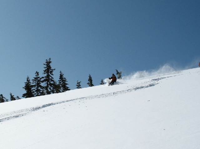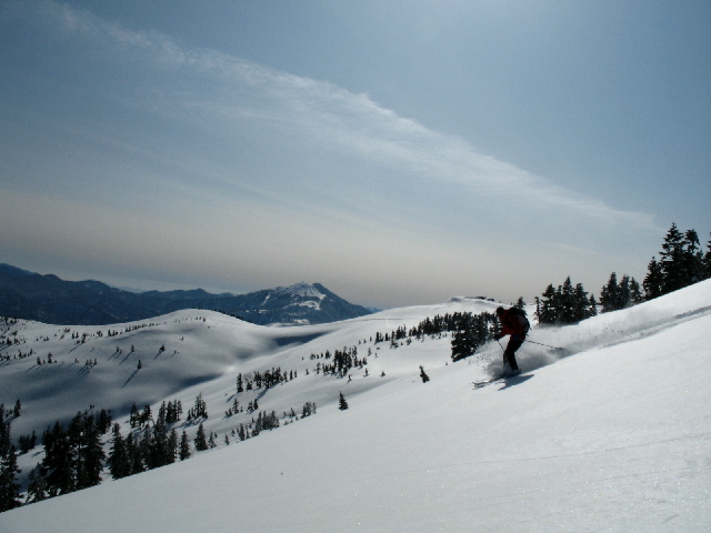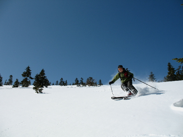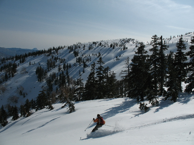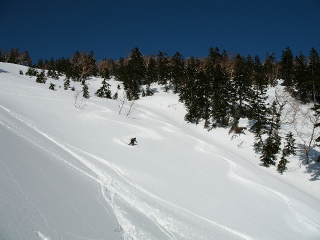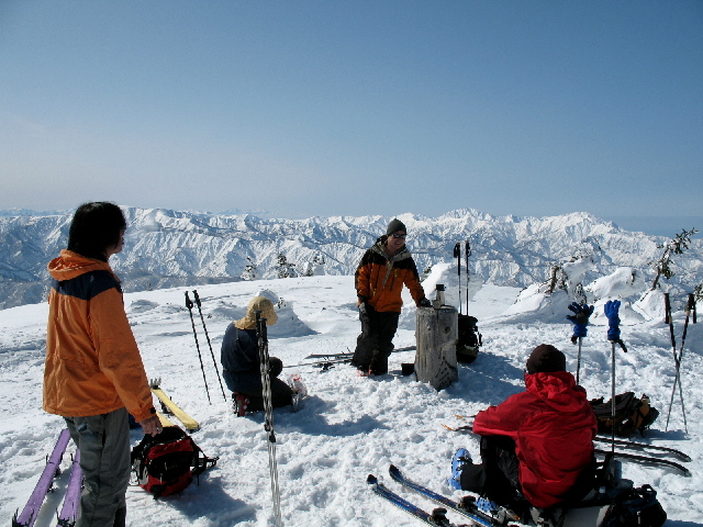 《山行日》07/02/25(日) 《参加者》増渕、溜口、稲江、(水戸部、西郡) 報告者:稲江 《日程》大田原5:45⇒滝沢橋手前P8:30〜電波塔10:15〜森林限界11:50〜頂上13:00〜源六郎沢滑降〜登り返し〜滝沢 橋手前P16:30⇒帰宅 《要約》無風快晴。天気と雪質に恵まれて今日も楽しい山スキーとなった。 《本文》集合場所の大田原に行ってみると、参加予定でなかった○○さんがいた。あれ?予定は?どうにか都合をつけたら しい。昨日の嵐がウソのように今日は無風快晴。昨日のリベンジで会津駒に行く事にした。森林限界を抜けたあたりから風 が吹くかな…と思っていたけど、全く風は吹かなかった。展望も良く、遠くの山まで良く見える。各自のカメラで撮影大会 が始まる。ポカポカ陽気だったので山頂にて、最高の景色を眺めながらのんびりする事が出来た。雪が少ないので沢を滑る のは無理かと思っていたが、大丈夫そうなので源六郎沢を滑る事にした。上部の部分は最高の雪質。段々との雪質が難しく なるものの、十分に楽しんで滑る事が出来た。沢が徐々に狭くなってきて、ターンをするのが難しくなる。所々、段差の激 しい部分もあり、降りるのに注意が必要。足がものすごく疲れる。いつもの登り返し地点まで滑り降りるのは危険と判断し て、途中から急斜面を登り返した。尾根に戻り、電波塔からは堰堤を滑り降りたが、既に雪がクラストしていてかなり難し い状態になっていた。雪にやっつけられながら『これも山スキーの醍醐味の一つだね』と思い、山を思う存分楽しみました。