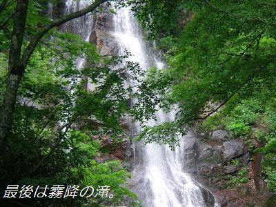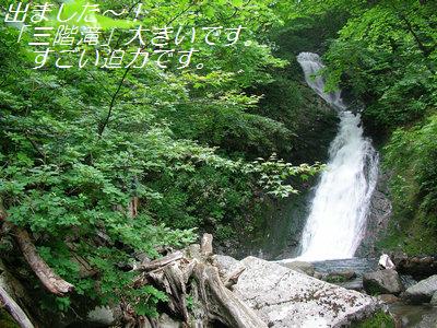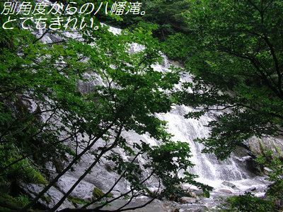 安達太良東面 湯川・沢登り 《山行日》07/07/08 (日) 《参加者》稲葉昌弘、植木(報告 植木) 《日程》矢板6:20--塩沢温泉9:00/9:20〜遡行開始9:40〜三階滝10:50〜二俣11:30〜左俣偵察ゴルジュ滝11:40〜二俣11:50/ 12:10〜霧降の滝12:35/12:50〜僧悟台13:10/13:20〜塩沢温泉14:30/14:50--矢板17:20 《要約》梅雨の晴れ間、安達太良の湯川は思った以上に楽しめた。 《本文》風邪引き復帰の稲葉昌弘さんと出かける。天気の回復が遅いのに合わせて結局二本松まで下道で行く。本宮の松屋で 朝食。塩沢スキー場駐車場にて準備をして、早速沢に降りるが暗いので登山道に戻る。橋のところから沢に入っても暗いのが 続く。へつりが楽しい。明るい場所で小休止、このまま終わってしまうのかと思ったところ三階滝!!デカイ!ここは巻き道 がしっかりしており安心。登山道からの観瀑コースがきている感じ。その上はナメと滝の連続で飽きることがない。二俣にき れいな八幡滝がかかる。お休み前に左俣を下見する。ゴルジュの中に直瀑があることを確認して二俣に戻りスダレ状の八幡滝 を眺めながらの大休止。やっと右俣に入り歩き出すとその上はナメナメナメ。信じ切れないぐらいにきれいなナメである。最 後の直瀑から登山道を歩き塩沢スキー場に戻る。