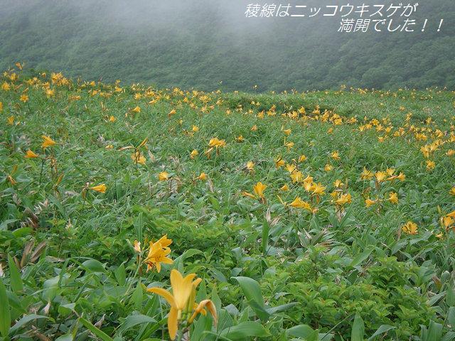 稜線で小休止の後歩き出すと。。。ヤッパリでました、ニッコウキスゲ。ガスが湧いているものの結構いい感じで咲いてい