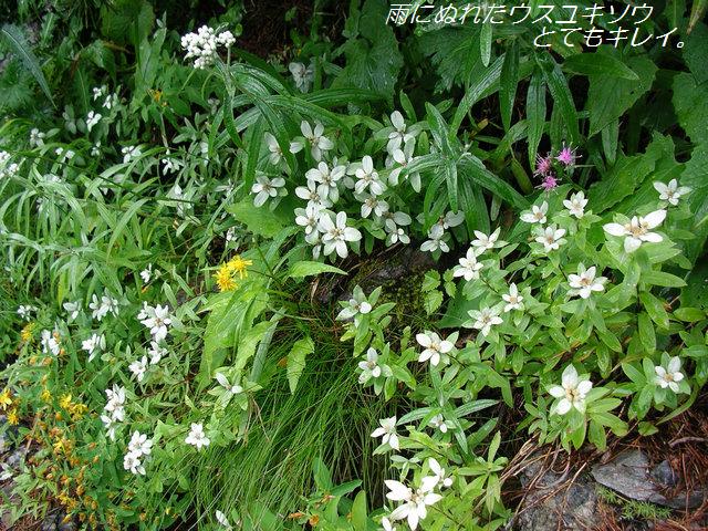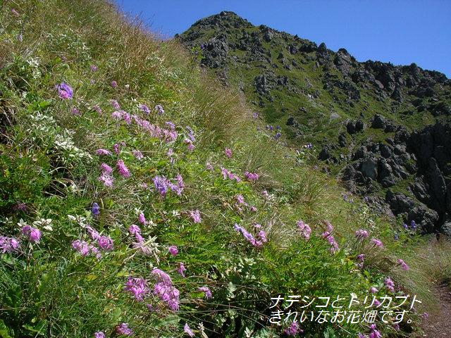 《参加者》植木 《日程》→は電車バス、--は一般道路、==は高速道路、〜は登山行動 8/21(火)矢板13:15→宇都宮→大宮→小田原→熱海→静岡19:32(泊) 8/22(水)静岡6:00/8:15→畑薙第1ダム11:30/12:00→椹島12:50/13:10〜赤石小屋17:20(泊) 8/23(木)赤石小屋5:00/9:05〜富士見平9:45〜北沢源頭10:50〜赤石岳12:30(泊) 8/24(金)赤石岳5:00/6:30〜小赤石岳7:05〜大聖寺平7:50〜荒川小屋8:30/8:45〜中岳10:40〜東岳(悪沢岳)12:00〜 丸山12:25/12:50〜千枚岳13:30〜千枚小屋13:55(泊) 8/25(土)千枚小屋4:30/5:35〜椹島9:50/10:30→畑薙第1ダム11:25/12:30→静岡15:57/16:15→上野19:55/20:17→矢板22:34 《要約》平謙さんからのお誘いにのって南アルプス。天気と眺めに恵まれた「花の山旅」を満喫できた。 《本文》 8/21(火)午前中で仕事を終わりにして青春18切符を活用、静岡に向かう。6時間と少しで到着した。今朝までの5:30発がなく なったので明日朝は8:15。バス停の下見をしてゆっくりしました。 8/22(水)近くのファミマでお茶とビールを購入。バスに乗る。途中で2階休憩しての3時間の乗車。畑薙ダム手前で降車。そこ から20分ほど歩いてダムサイトまで。待っていた東海フォレストのバスにすぐに乗り継ぐ。ギューギューだ。茶臼に行く人が 長い吊橋を渡っていった。赤石ダム付近から聖が見えるということだがガスの中。その先の沢筋から赤石が見えるはずだが同 様。椹島ヒュッテに下らずに赤石登山口で降ろしてもらう。水をタンクのしずくで満タンにして出発。 梯子を登るとそこから急登のつづら折。ゆっくりと進む。尾根に出て緩やかになると雨が降り出した。林の中なので初めは体 がぬれなかったが、それでも傘がいるようになった。ほとんど人に会わずにポコッと赤石小屋に出た。受付をして水をもらい テントを張ると雨が本格的になった。夜遅くには雷が近くで落ち雨が強いときが2時間くらい続いた。 8/23(木)明け方も雷があり大雨。2度寝を決め込む。明日の予報は晴れ。明日の稜線歩きを楽しみにきょうは赤石避難小屋まで と決める。8:00ごろには落ち着いたのでテントを撤収して9:10に出発。北西の風が強い。富士見平に出てみると360度の展望! 天気は回復方向だ。北沢源頭で顔を洗う。気持ちいい。稜線に出ると眺め最高。北の仙丈、間ノ岳などが良く見える。頂上に 着くと南方面がドバーンと。聖、光が見える。一つ一つの山がとても大きい。小屋の風下でテントなどを乾かしながら管理人 さんと2人で日向ぼっこをして昼からやる。気持ちいい。 8/24(金)きのうの夕方からガスガス。それに強風。今朝も同じ感じ。ガスが晴れるのを待っていると千枚小屋に行けないので 諦めて6:30に出発する。荒川小屋に着くとガスが晴れた。小屋のすぐ上からお花畑が広がっていた。マツムシソウとトリカブ トがきれい。そよ風が吹く眺め最高の稜線を歩くこの幸せ。せっかくだから中岳にも寄る。東岳周辺にはシコタンソウも多い。 頂上西側の斜面ではマツムシソウとトリカブトとナデシコ、さっき以上のお花畑!!千枚岳周辺にはタカネビランジが満開。 ポコポコ下って謙ちゃんの待つ千枚小屋に到着。その後テントでスキーの話をして寝る。 8/25(土)5:30には椹島に向けてあわただしく出発。お世話になりました。だらだらと下るばかりだと思っていたら最後にトラ バースルート崩落に伴うルート変更。いやあ、参りました。そんなこんなで椹島に到着。シャワーを浴びてさっぱりしてバス に乗車。光からの縦走ツアー客と同乗。5泊だそうだ。忙しいらしいそして高いらしい(\108,500)。畑薙ダムで1時間待ち。 お昼(おいなり)がおいしい。井川でのトウモロコシもおいしい。ホント、花がきれいな南アルプスだった。あの山並みをど こまでも歩く人の気持ちがわかった気がする。
