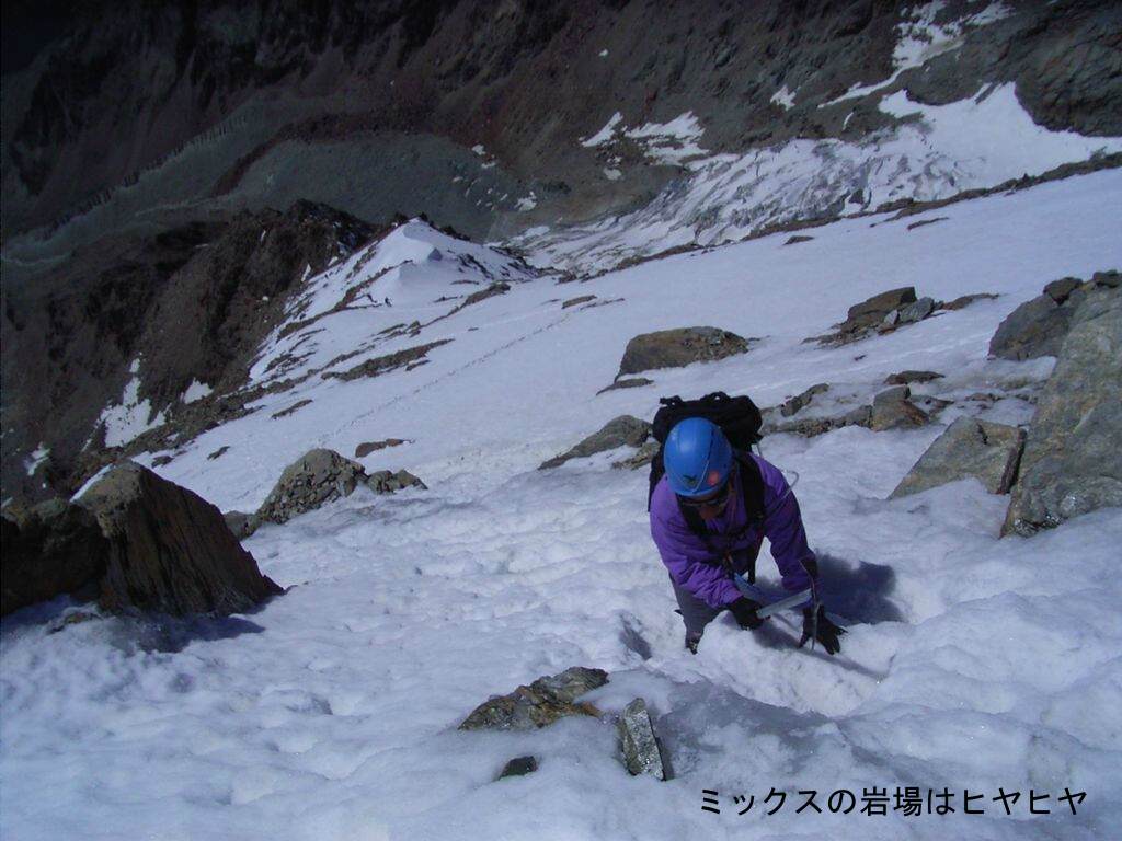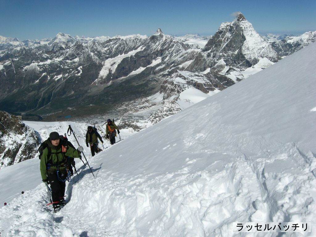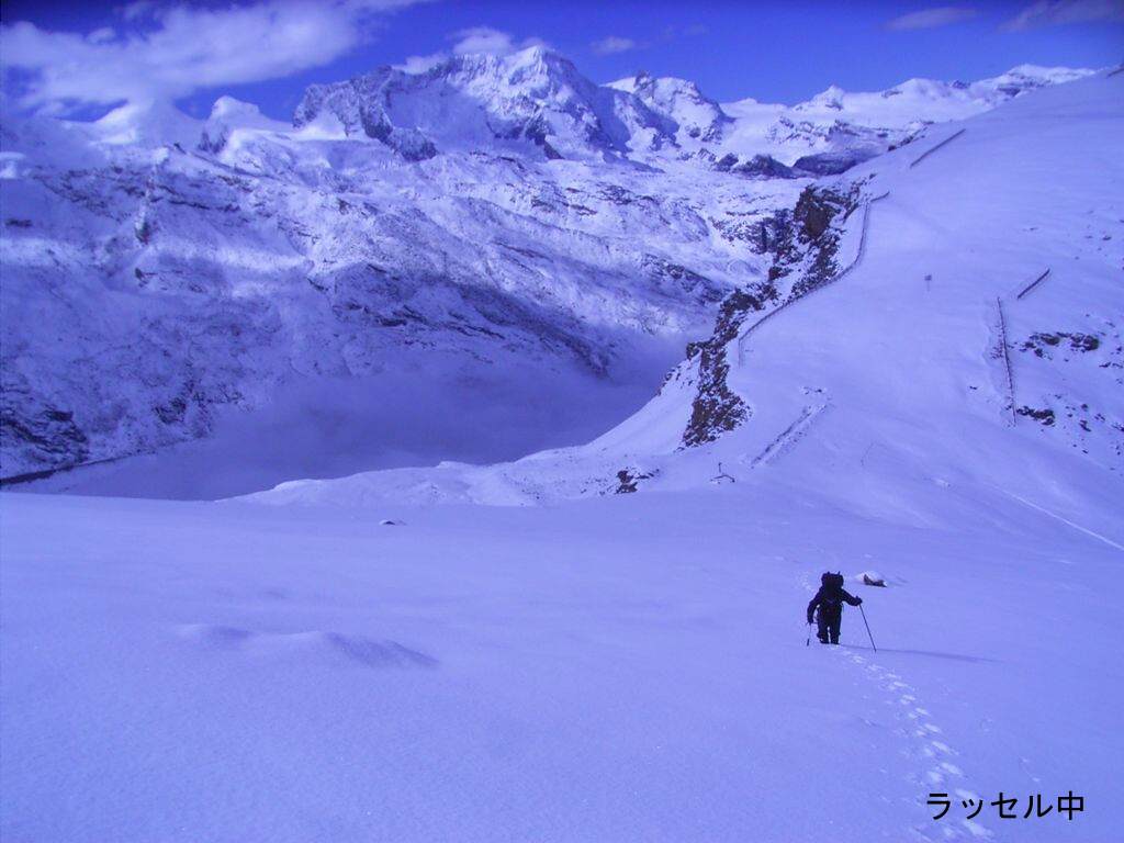 《参 加 者》稲葉ズ、桜井(遠峰山岳会)、マティアス(スイス山岳会) 《日 程》→は乗り物にて移動、〜は登山行動 8/03(金) 移動日:成田→中国(上海)→イタリア(ミラノ) 8/04(土) 移動日:ミラノ→スイス(ザースグルント) 8/05(日) 登山日:ザ−スグルント→クロイツボ−デン→ホ−ザ−ス 〜ラッギンホルン(4010m)登頂〜クロイツボ−デン〜ザースグルントCS 8/06(月) レスト:ザースグルントCS→ザースフェ−→ザースグルントCS 8/07(火) 移動日:ザ−スグルント→ランダ→ツェルマットCS 8/08(水) 停 滞:ツェルマットCS 8/09(木) 停 滞:ツェルマットCS 8/10(金) 登山日:ツェルマットCS→ウインターロートホルン〜オ−バ−ロ−トホルン(3415m)登頂 〜ウインターロートホルン→ツェルマットCS 8/11(土) 登山日:ツェルマットCS→クライン・マッターホルン〜ブライトホルン(4164m)登頂 〜クライン・マッターホルン→ツェルマットCS ※夜:桜井・マティアスさんと合流 8/12(日) 登山日:ツェルマットCS→クライン・マッターホルン〜ブライトホルン(4164m)登頂 〜クライン・マッターホルン→ツェルマットCS 8/13(月) 移動日:ツェルマットCS〜FuleAlpe小屋 8/14(火) 登山日:FuleAlpe小屋〜リンプフィッシュホルンに向けて登山開始 〜3000m付近で雨に降られ敗退〜ツェルマットCS 8/15(水) 登山日:ツェルマットCS→リッフェルベルグ〜リッフェルホルンの岩ル−ト 〜ThamometerCouloir(9P)V〜V- 〜リッフェルホルン(2927m)登頂 〜リッフェルアルプ→ツェルマットCS 8/16(木) レスト:ツェルマットCS 8/17(金) 移動日:ツェルマット→ミラノ 8/18(土) 移動日:イタリア(ミラノ)→中国(上海)→ 8/19(日) 移動日:成田帰国 《要 約》期待に胸を膨らませスイスに旅立ちましたが、天候不順に泣かされ予定の登山をすることができません でした。予定していた山々を登頂することが出来なかったのは非常に残念ですが、次に繋がる遠征になったことは間 違いないと思います。ご支援ご協力を頂きました皆様に、この場をお借りしてあらためて御礼を申し上げます。 ありがとうございました。
