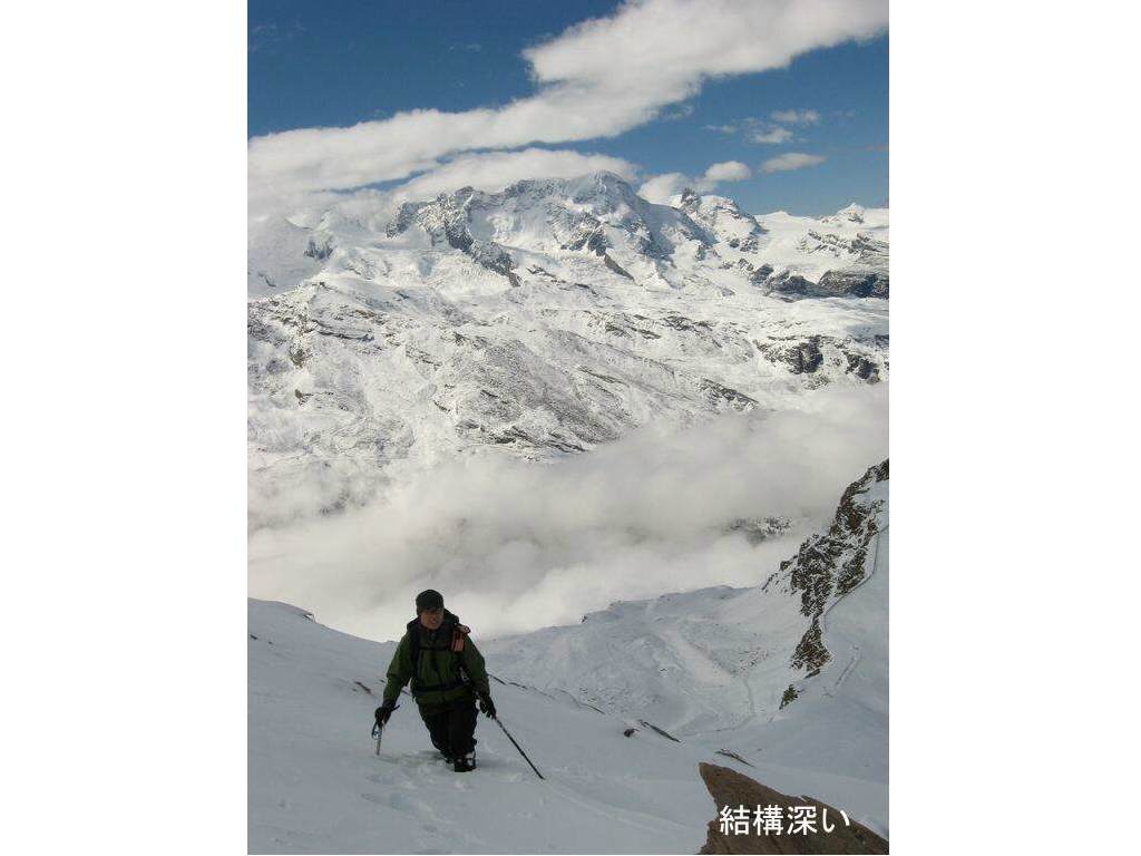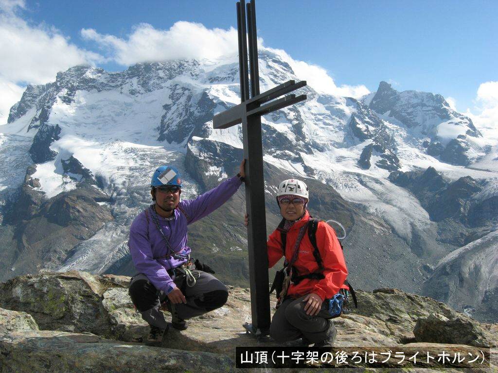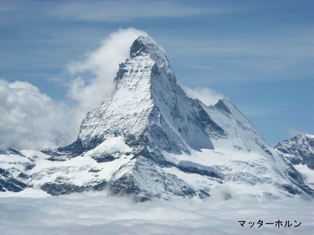 【8/10】ラッギホルン登頂後、8/7〜8/9の3日間は大雨に降られる。予定していたヴァイスホルンは挑戦することさえ 出来なかった・・・。山では大雪が降り、8/9の朝はCSにもが積もった。8/10この日の朝も霧が深く、街からは山は全 く見えない。今日も天気が悪いのか・・・と憂鬱な気持ちで街に出かけた。しかしケーブルカーの駅で確認できるLIVE CAMERAを見たら、ウソのような光景が映っていた。3000m以上は晴れているようだ。信じられない。半信半疑で乗り 物を乗り継いでウンターロートホルン展望台(3103m)まで行ってみる。展望台に到着する寸前まで霧に包まれてい たが残り100m付近で雲の上に出た。ウソのような光景は本当だった。雲海の上に山々が…。景色は最高だが山々は 真っ白。折角なので通常は展望台からハイキングコ−スで登れるオ−バ−ロ−トホルン(3415m)を正面からラッセル で登った。低くても自分達だけのトレ−スは最高(低いといっても日本では2番目の高さ)。頂上から360°の展望を 楽しむ。しかしよく積もったなぁ〜。マッターホルンが良く見えたが、白すぎる。雪が溶けてくれるか心配だ。