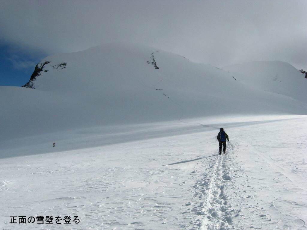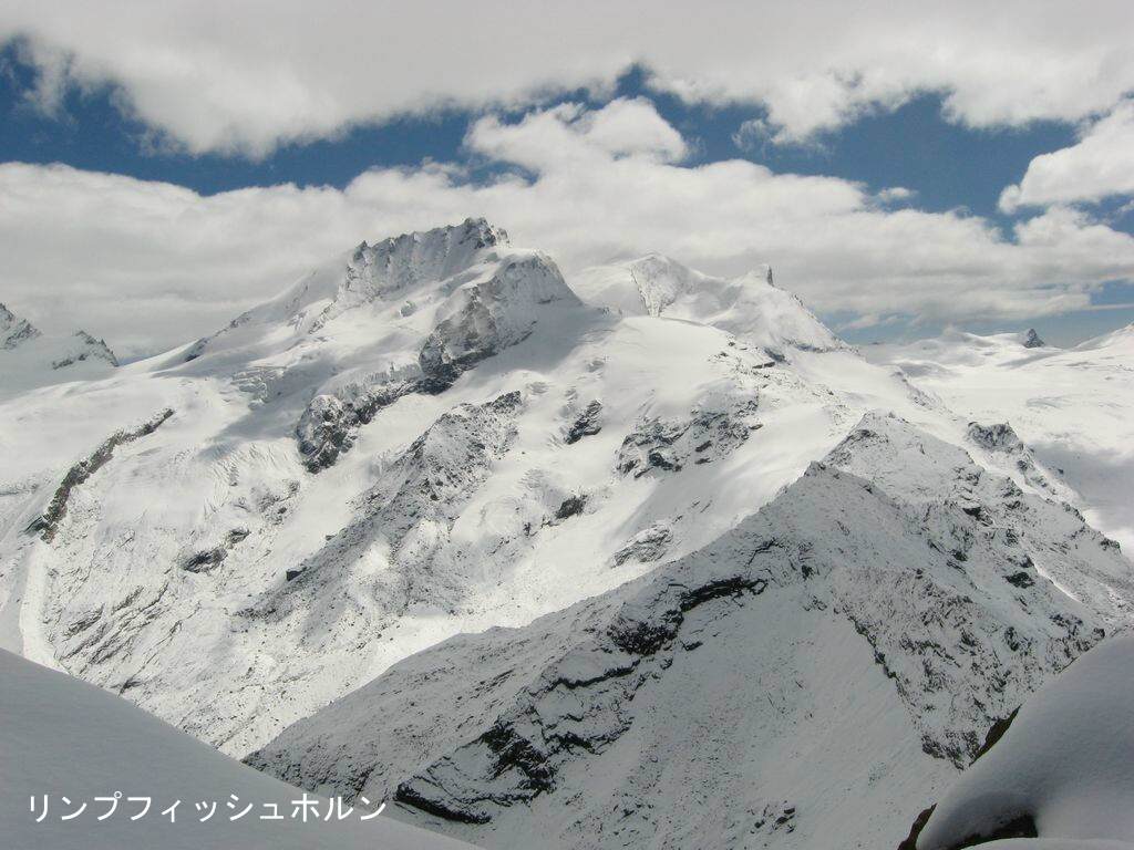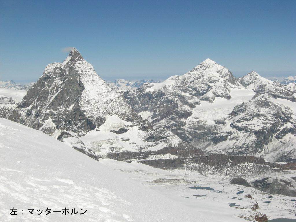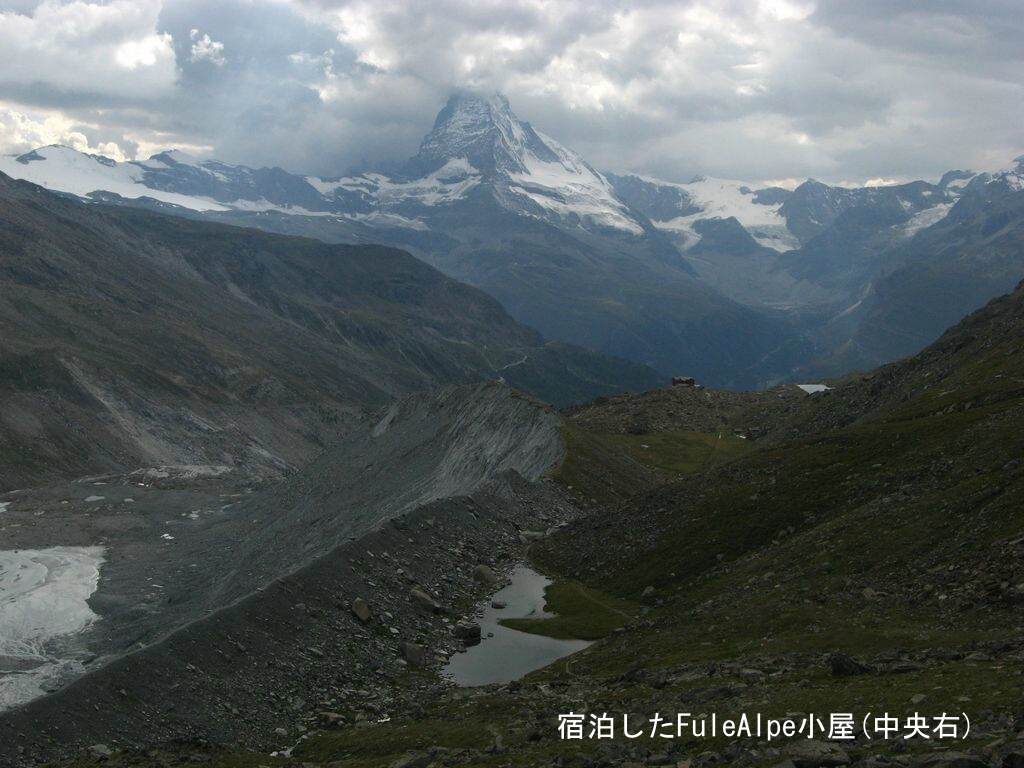 【8/11・8/12】櫻井・マティアスさんと合流してからブライトホルンには登る予定だったが、好天の周期に入り待ち きれずブライトホルン(4164m)に登る。クライン・マッターホルン展望台(3883m)まではケーブルカーで移動。展望 台から登り始める。頂上では風が強く、寒かったが高度は感じない。高度順応は問題ないようだ。沢山の人が登っ ており、トレースはバッチリ。8/12は4人で登頂した。両日とも天候に恵まれ景色は素晴らしかったが、登り350mh しかなく1〜2時間で簡単に登れてしまうのでちょっと物足りない感じがした。何度も単眼鏡でマッターのルートを 見てみたが登っているクライマーを確認する事が出来ない。相談した結果、マッタ−ホルンは中止にした。リンプ フィッシュホルンへ転戦する事に決めた。FuleAlpe小屋泊でチャレンジする事にした。