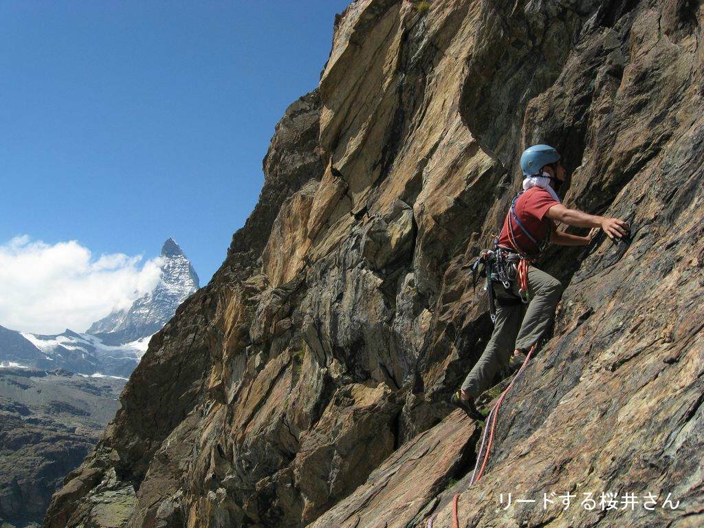 【8/15】昨日の鬱憤を晴らすべくリッフェルホルンの岩ル−トへ。この岩場はコルナーグラード鉄道のRiffelberg駅 降りてすぐの場所にある。ThamometerCouloir(9P)V〜V- を登る。快適な凹角を登るル−トで素晴らしい。稲葉 ズは今回の遠征はクライミングシューズを持ってこなかったので、クライミングシューズを持参していた桜井さん にリードしてもらい、稲葉ズは登山靴でオ−ルフォロー。流石に核心のV- は登山靴ではヒヤヒヤしたが、フリーで クリアー。桜井さんは見事全ピッチオンサイト!? 結局、予定していた4000m峰の山は2座しか登頂することが出来ず非常に残念ですが、ヨーロッパアルプスという目標 に向けて登山活動を行い、充分に準備して取り組めた遠征だったと思います。天候には恵まれませんでしたが、出来 る範囲で充実した山行が出来ました。今後の登山活動に生かしていきたいと思います。