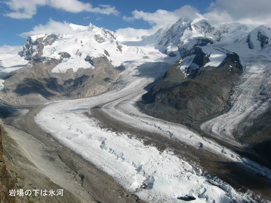 【8/5】予定通り、ラッギンホルン(4010m)に登ぼる。雪のルンゼ〜岩稜〜頂上直下のミックスと変化があって面白い 山だった。Saas Gnund → Kreuzboden → Hohsaas はケーブルカーで移動。Hohsaas(3098m)展望台から登り始める。 Hohsaasは4000m峰が18座も見渡すことが出来ることで有名な展望台。この日は快晴で最高の景色に包まれながら登 山を楽しむ事が出来た。予想以上に雪が残っており、頂上直下のミックスの部分では結構ヒヤヒヤ。しかも、時差 ボケなのか?移動疲れなのか?高山病なのか?かなり私の体が疲れている。足取りが重くなかなかペースをあげる ことが出来ない。下りもゴンドラを使用する予定だったが、そのおかげで帰りのゴンドラの時間に間に合わずキャ ンプ場まで歩いて下る事になってしまった。本当に疲れていたので、歩いて帰ると決まった時は泣きたい気持ちに なった。しかし、歩くしかない。長い長いハイキングコースをひたすら歩く。サマータイムに助けられ、どうにか 明るい時間(PM8:00)にCSに到着。4010mの頂から村までの標高差2600m。もちろん足はガクガク。予定外の長時間行 動をしてしまった為、今後の登山に備えて体を休めることになり、翌日登頂予定だったアラリンホルン(4027m)は中 止することになった。