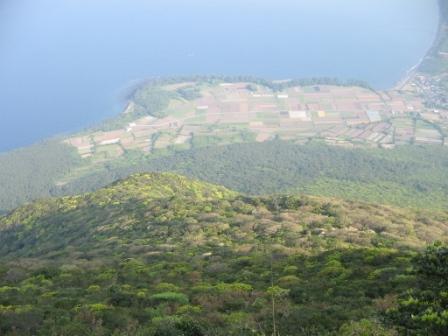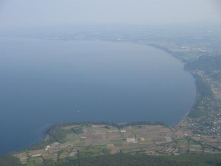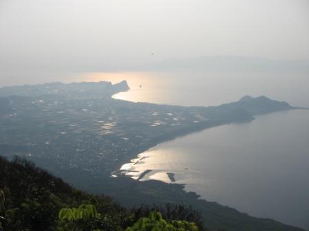 る〜。九合目付近からは薩摩半島の海岸線が見える。こちらも素晴らしい〜。海が眼下に広がる。まるで飛行機に