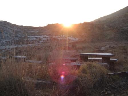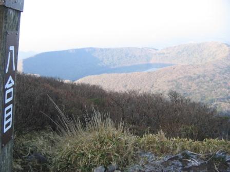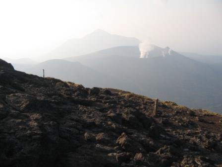 ●本文:九州の山旅2日目〜。えびの高原は1200m〜霜が降り窓ガラスが凍っていた。明るくなると共に起床〜。 この日は、百名山の2座目、韓国岳に登る。 登山口に着くと、先客があった。日の出を楽しみながら、あっという間に頂上に着く。山頂からは、昨日登った 高千穂が素晴らしかった〜。ここでも360度の展望を楽しんだ後、速攻下山〜。この後、山を始めた頃の山仲間と 会う為に、宮崎へ移動〜。温泉とお昼に食べた宮崎牛〜そして何より久しぶりに会った仲間が、この後の山行に 対しパワーをくれた。宮崎の高千穂・天の岩戸を観光し、祖母山の登山口・尾平に移動する。