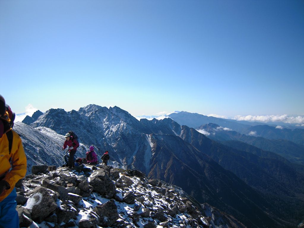 ・10/11 昨日の雪の為に予定を変更して槍ヶ岳に登る。朝から天気もよく、周りの山が良く見えた。前に槍ヶ岳に