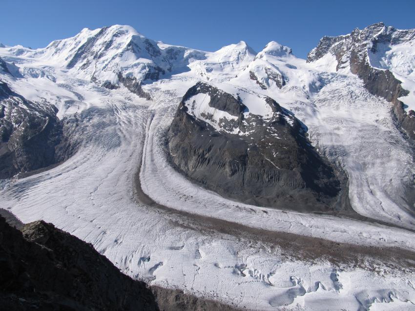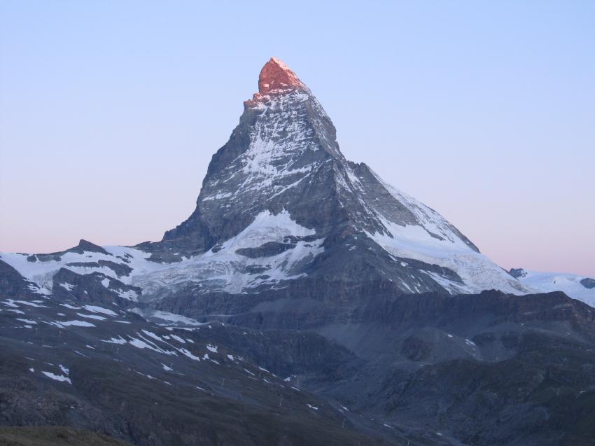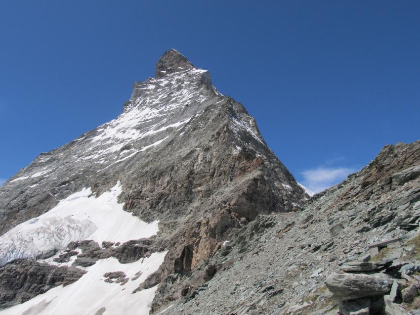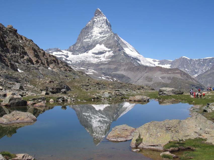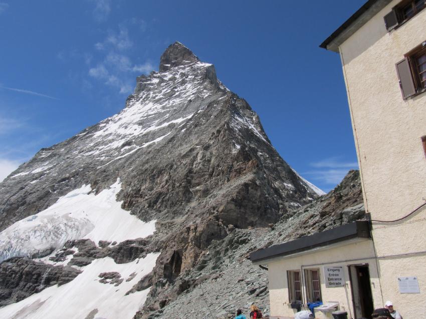 7月2日:サン・モリッツから世界一遅い氷河特急に乗りツェルマットに移動。ツェルマットに到着後、登山電車 でマッターホルンを間近に望む山岳ホテル「リッフェルベルク」に宿泊。 7月3日:登山電車でゴルナーグラード展望台へ移動、観光後、山岳ホテルまでハイキング。途中、逆さマッター ホルンが映る湖に寄りました。午後は、ツェルマットに戻りゴンドラとロープウェイを乗り継ぎクライン マッターホルン展望台を観光。 7月4日:マッターホルンヘルンリ稜ハイキング。山小屋まで行ってきました。小屋から見るマッターホルンは山 ではなく、巨大な岩でした