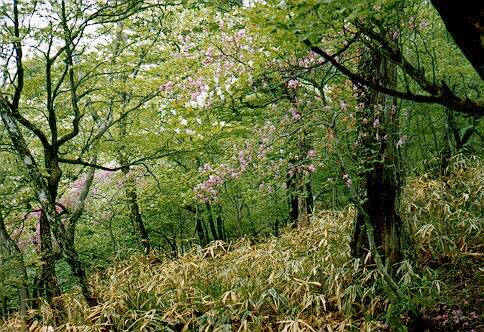 登山道付近に咲くムラサキヤシオとシロヤシオ